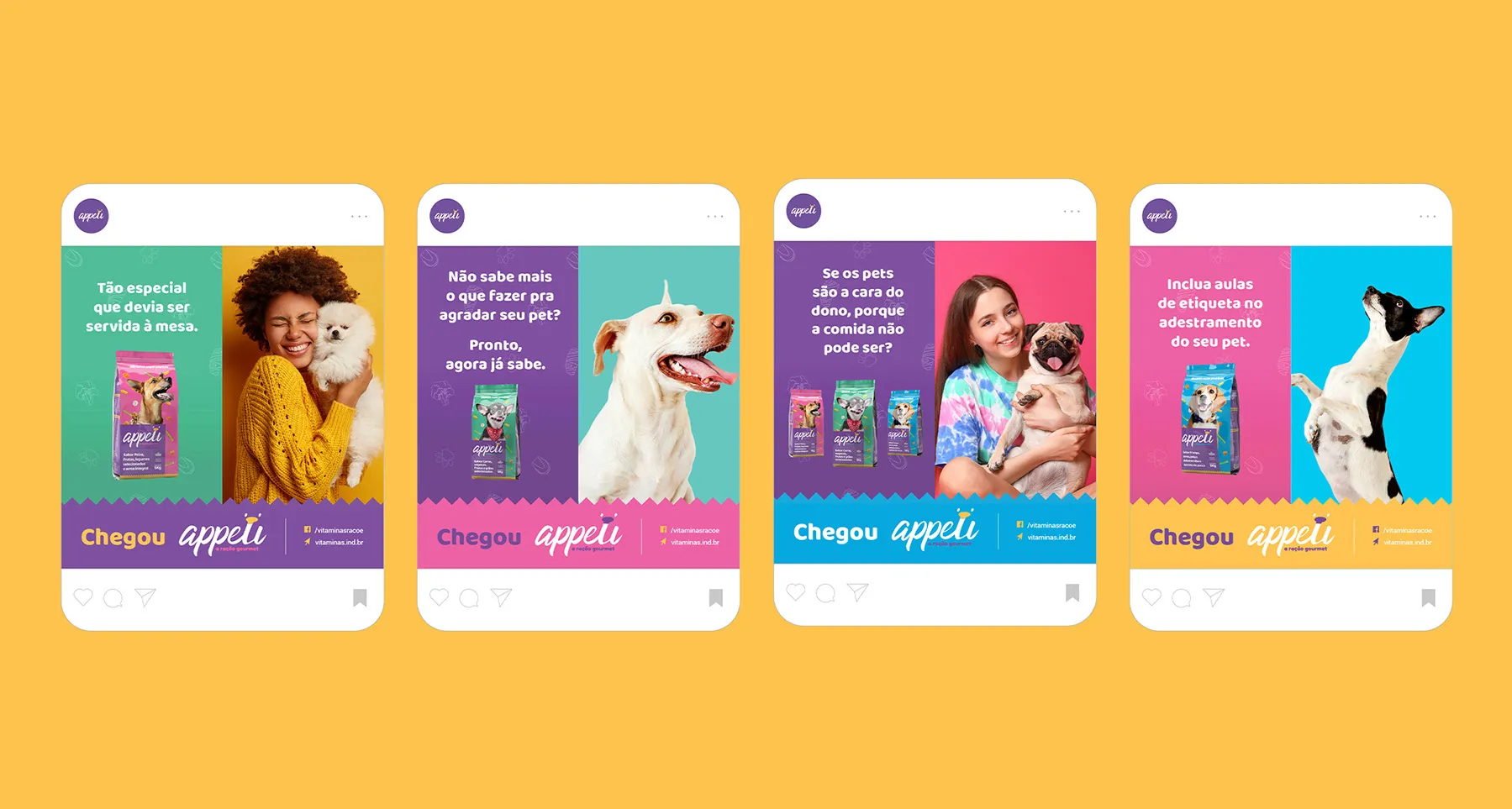 This project encompassed everything from packaging design to the publicity campaign. The guiding idea was that the identity should be cheerful and inviting, which is why we chose to use vibrant colors and photos that convey comforting and fun moments with pets. To depart from traditional premium packaging, we opted for a modern approach that would stand out from the typical offerings on pet store shelves.