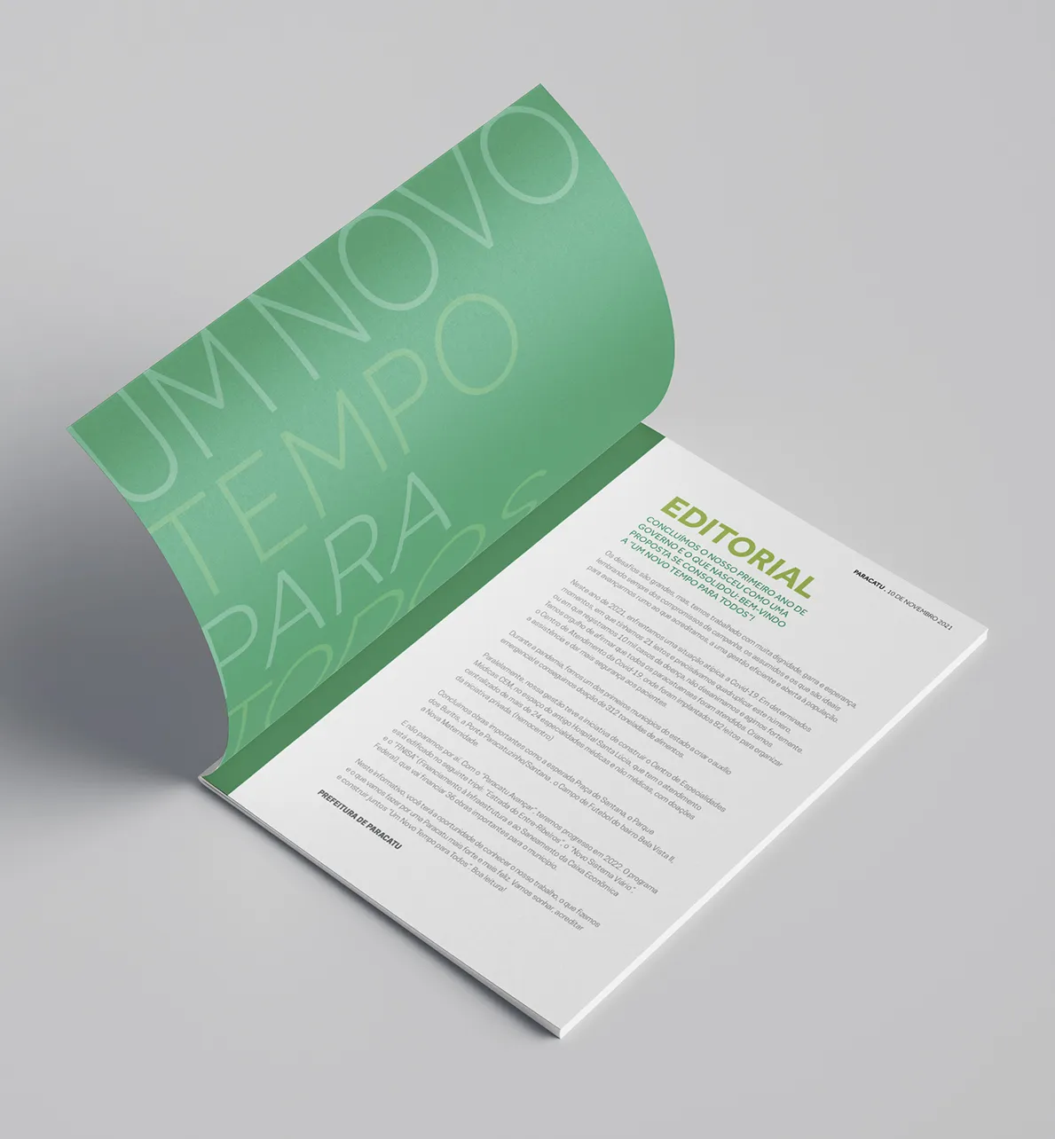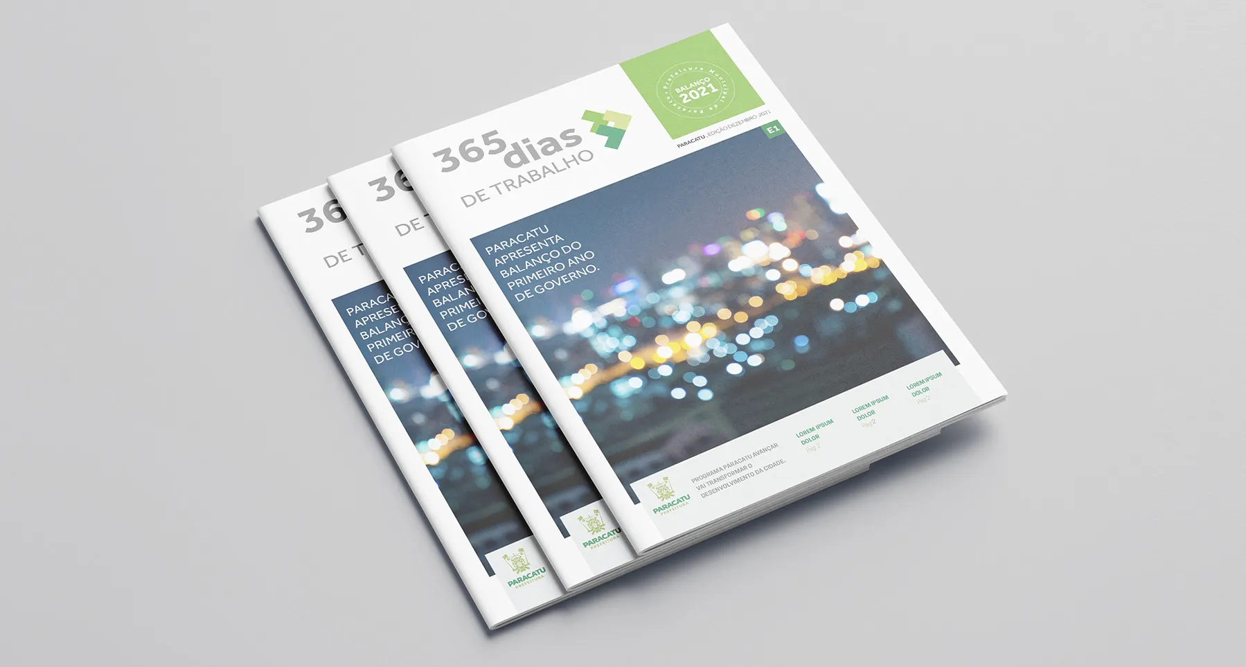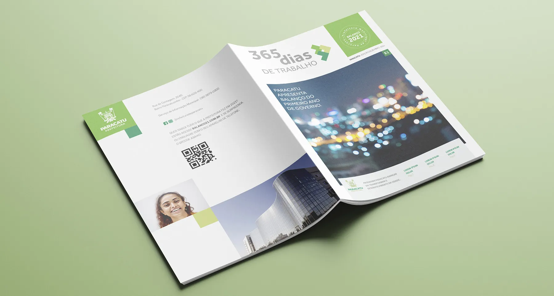 Project involving the design of the 2021 management report for the city of Paracatu. To reflect on 365 days of work, we chose a bold and imposing design—yet simple and functional. This approach was essential to convey the idea of progress that is accessible to all citizens, without exclusion. The use of green reinforces the identity of the administration, as it is the color associated with it.