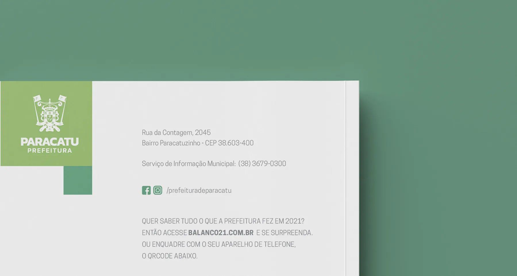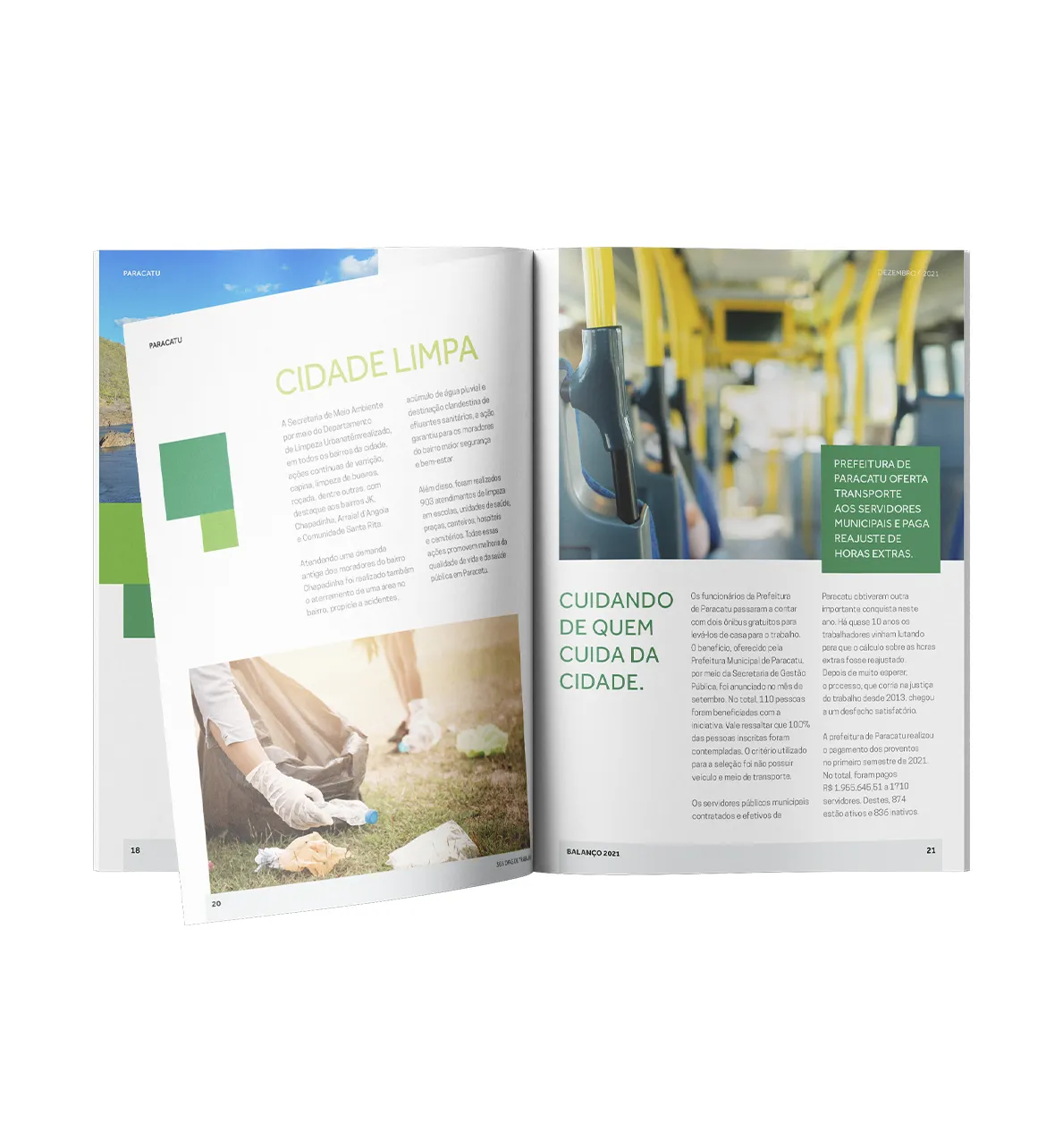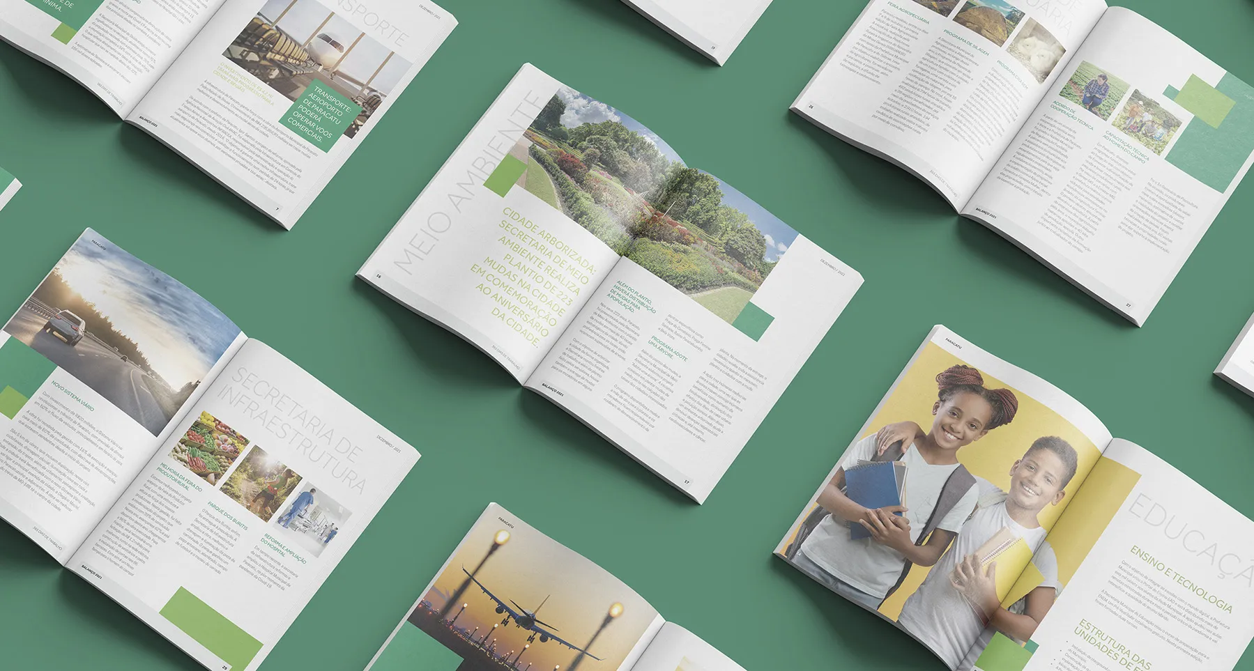 Project involving the design of the 2021 management report for the city of Paracatu. To reflect on 365 days of work, we chose a bold and imposing design—yet simple and functional. This approach was essential to convey the idea of progress that is accessible to all citizens, without exclusion. The use of green reinforces the identity of the administration, as it is the color associated with it.