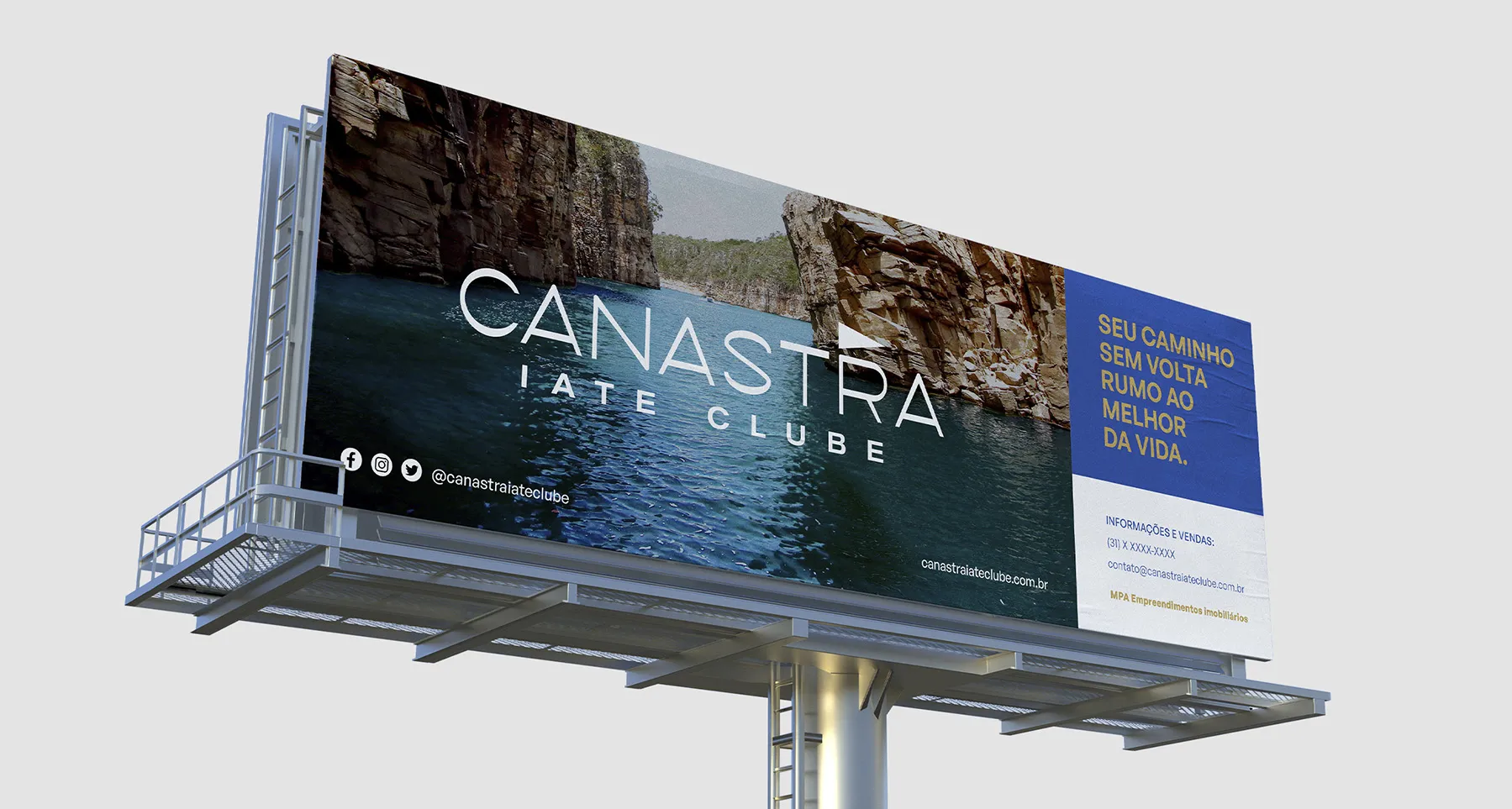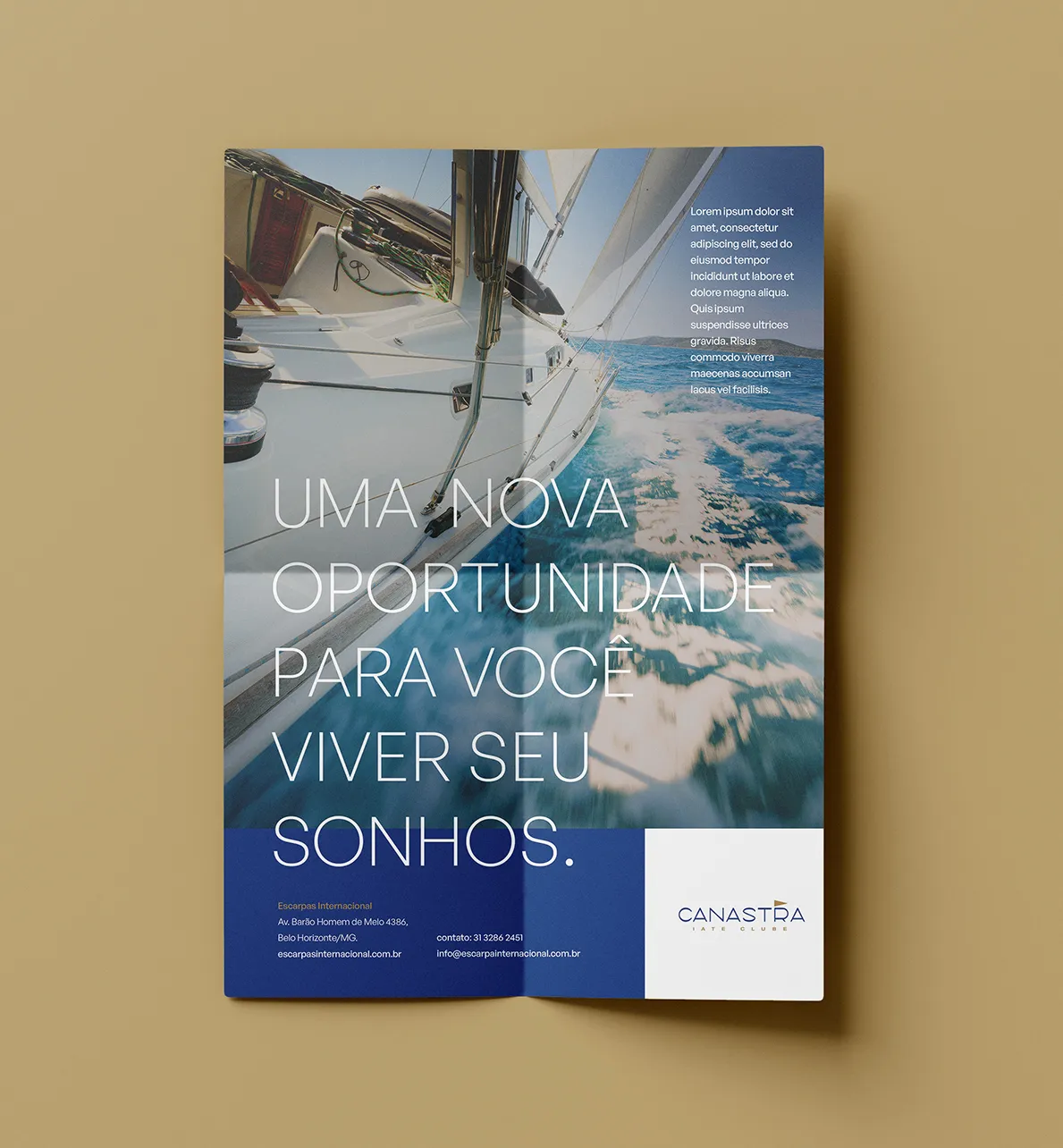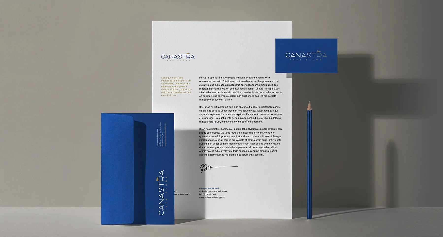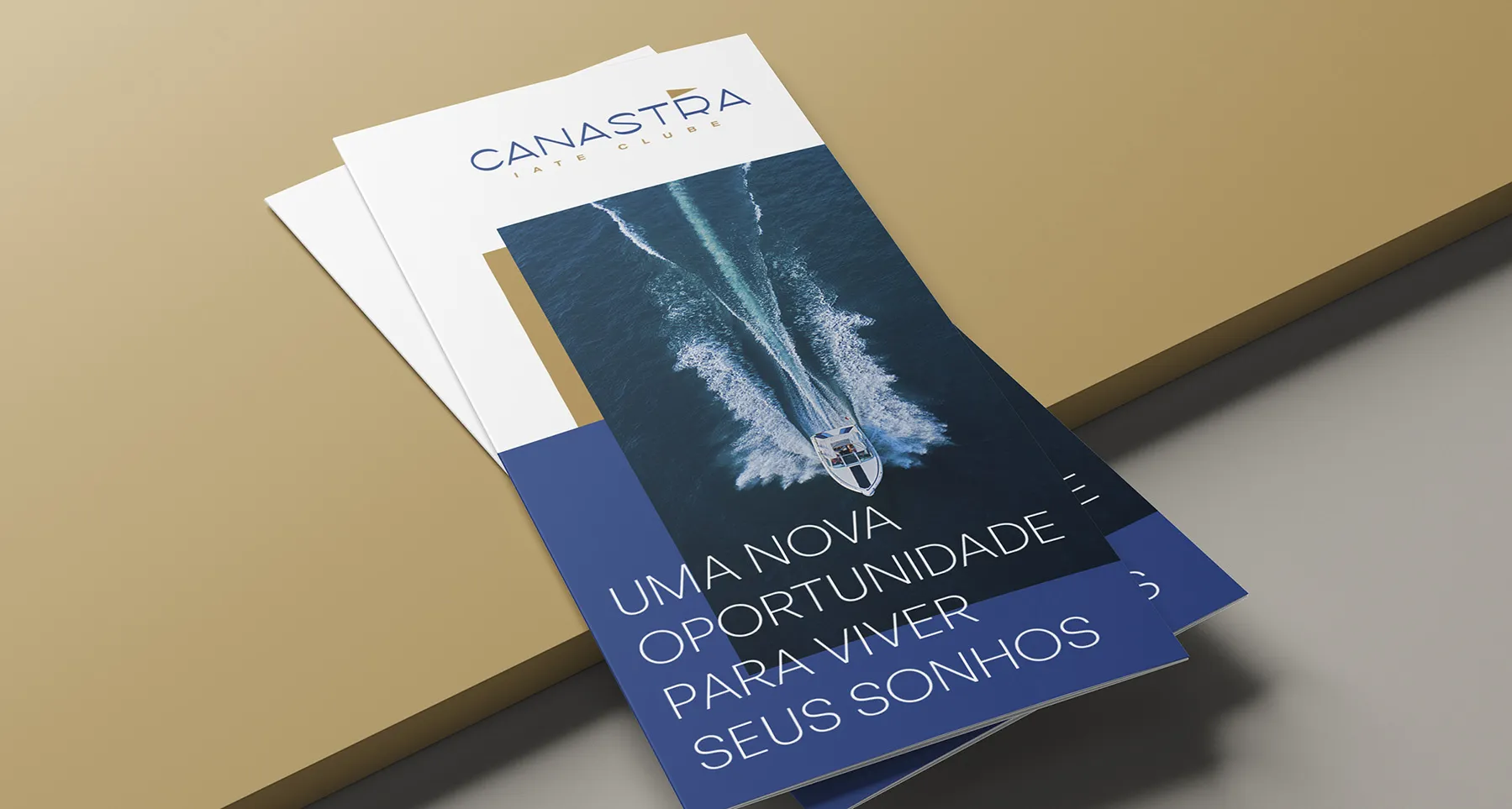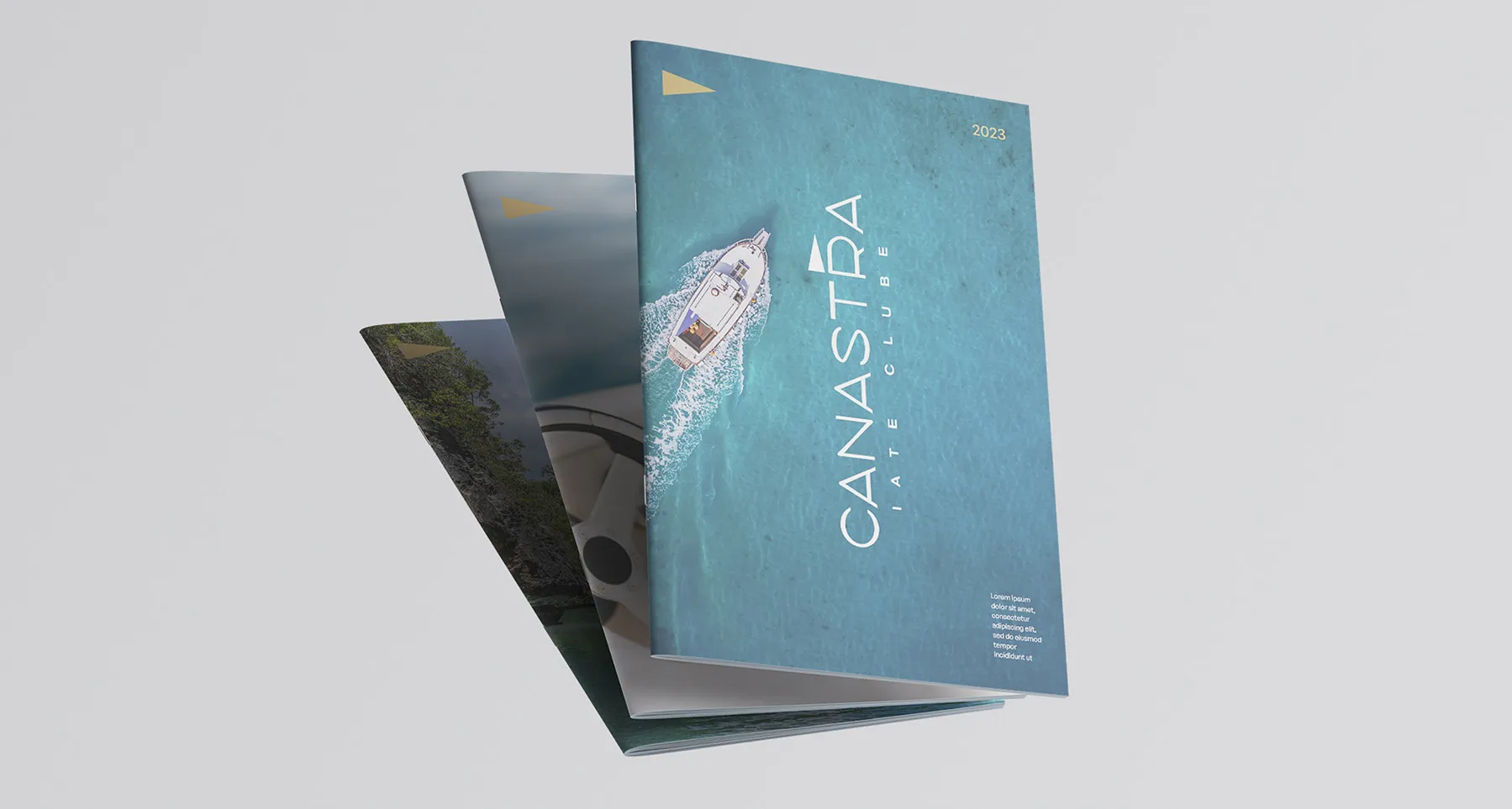 Canastra Iate Clube is a development that includes a marina, a garage, a public restaurant with bungalows, and the option to invest in high-end homes. The setting combines leisure and safety, with Nature as its backdrop and Lake Furnas as its central theme. The design process began with the client’s emphasis on pennants, highlighting how boats and marinas typically display them for identification. Another key consideration was the target audience, which consists of individuals with higher purchasing power. Therefore, we chose colors and typography that would resonate with this demographic. To strengthen the connection with the target audience, we incorporated a minimalist aesthetic to convey sophistication and refinement.