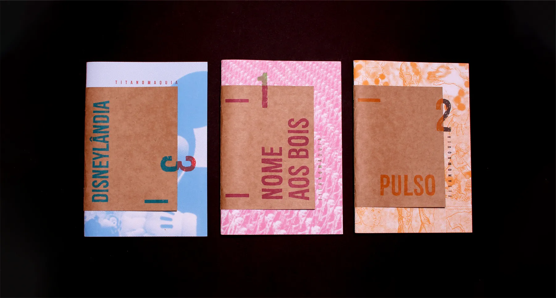 Titanomaquia Zine Collection – inspired by the work of the Brazilian rock band Titãs, this collection features graphic constructions and deconstructions that emphasize the human condition, exploring relationships from the micro to the macro level. The zine Nome aos Bois spotlights controversial and notorious figures who have negatively impacted society. Pulso focuses on diseases that affect the immune system. Disneylândia examines globalization processes and their adverse effects.